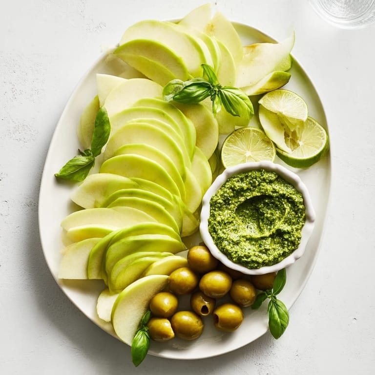 The magic of this board is that it's not just about looking pretty—it's about what happens when sharp, tart, briny, and herbal flavors collide on your palate. The sweetness of the apple is tempered by the lime's bite, and then the pesto brings this rich, garlicky depth that makes you reach for another apple slice just to reset and do it all over again. It's a conversation between flavors, not a solo performance.