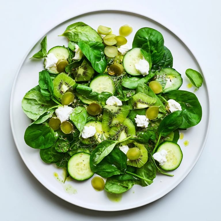 There's something magical about creating food that's beautiful enough to pause before eating. When you arrange this salad, you're not just combining ingredients—you're creating a moment. Each shade of green tells a different story: the bright pop of kiwi, the deep earthy tone of spinach, the briny olive. Working with monochromatic color palettes teaches you that subtlety creates sophistication in cooking just as much as it does in design.