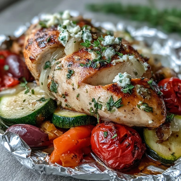 Save Bring the vibrant tastes of the Mediterranean to your table with these Greek Chicken and Veggie Foil Packets. Juicy chicken breast, colorful vegetables, and classic Greek flavors are wrapped in foil and baked to perfection. This zesty, healthy meal is ideal for easy weeknight dinners or grilling outdoors during warmer months.