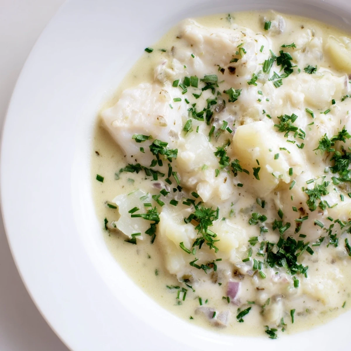 The magic here isn't in any secret ingredient; it's in how the potato starch thickens the milk into something creamy without any cream at all—well, almost. The gentle poaching of the fish keeps it tender and delicate rather than dense or flaky, and the butter-softened onion dissolves into the background, adding sweetness without presence. Every element in this stew has learned to play its part without trying to steal the spotlight, which is maybe why it feels so balanced and right.