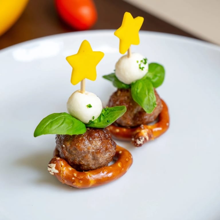 - Thread a pretzel stick (or rosemary sprig) with a cherry tomato at the base followed by a basil leaf a mozzarella ball another basil leaf and finally two mini meatballs stacked on top of each other.