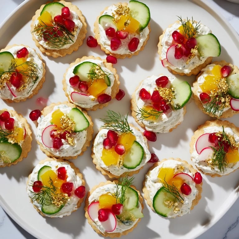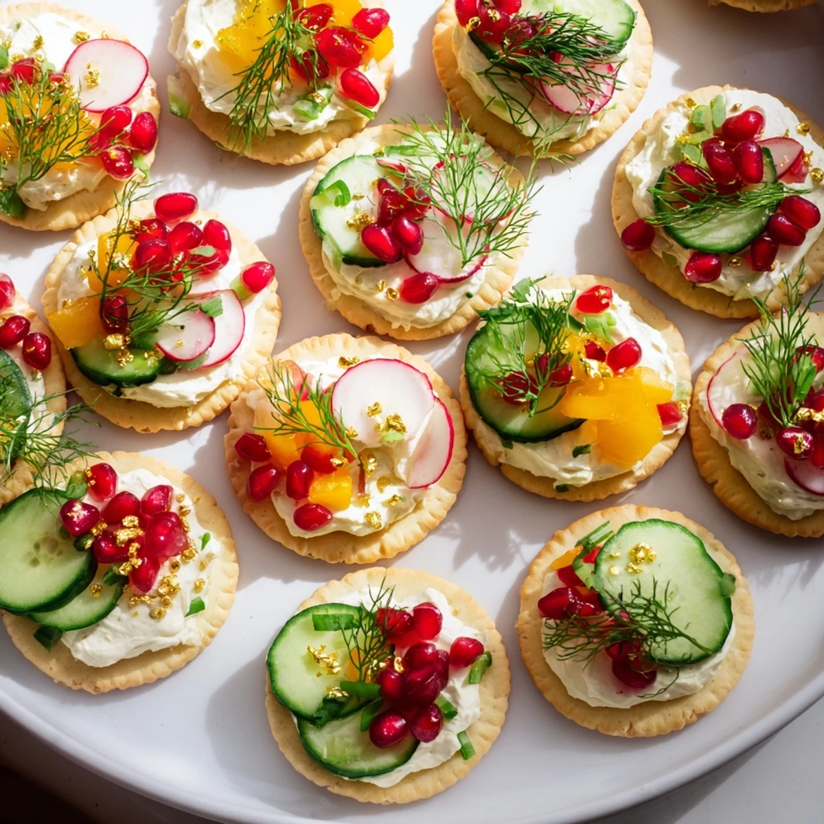 Save Festive, colorful crackers topped with creamy spreads, fresh vegetables, and savory garnishes—perfect for holiday gatherings and parties.