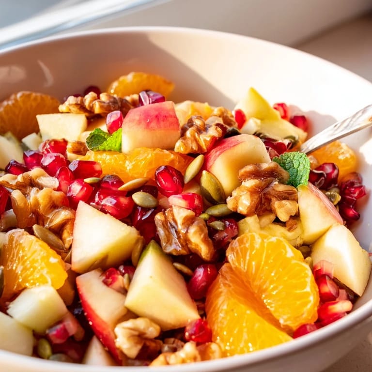 Absolutely. Try persimmons, kiwi, or grapes instead of pear. Blood oranges add beautiful color. In summer, swap in fresh berries or stone fruits while keeping the pomegranate and walnut base.