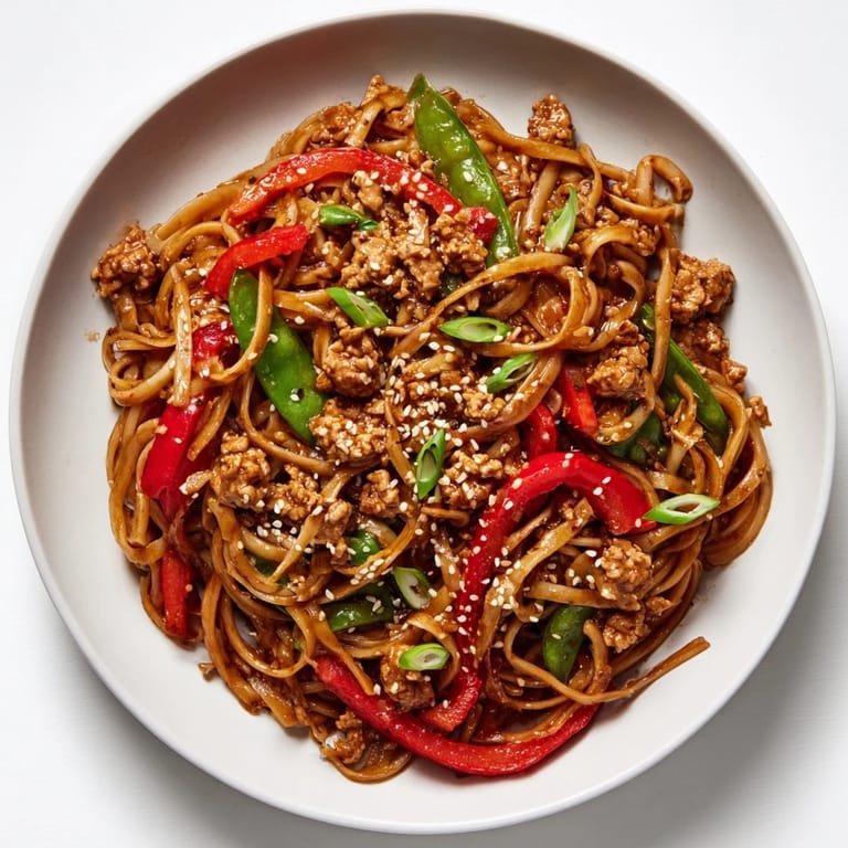 Save I threw this together on a Wednesday night when my fridge was half-empty and my mind was completely blank. I had ground chicken, a bottle of hoisin I'd bought for dumplings months ago, and some wilted snap peas I needed to use. What came out of that skillet surprised me so much I stood there eating straight from the pan. The sesame oil hit first, then the sweet-savory hoisin, and suddenly pasta night felt like something new.
