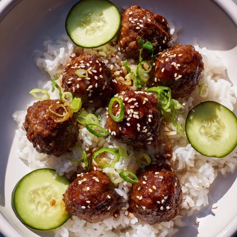 I remember my neighbor stopping by right as I was dividing the bowls, and she ended up staying for dinner just because the smell coming from my kitchen was impossible to ignore. That's when I realized this dish has that magic quality where it looks more complicated to make than it actually is, which always impresses people. The way the sesame seeds catch the light on top and the bright green cucumber slices next to the dark glossy meatballs make it feel restaurant-worthy, even though you're eating at your kitchen table.